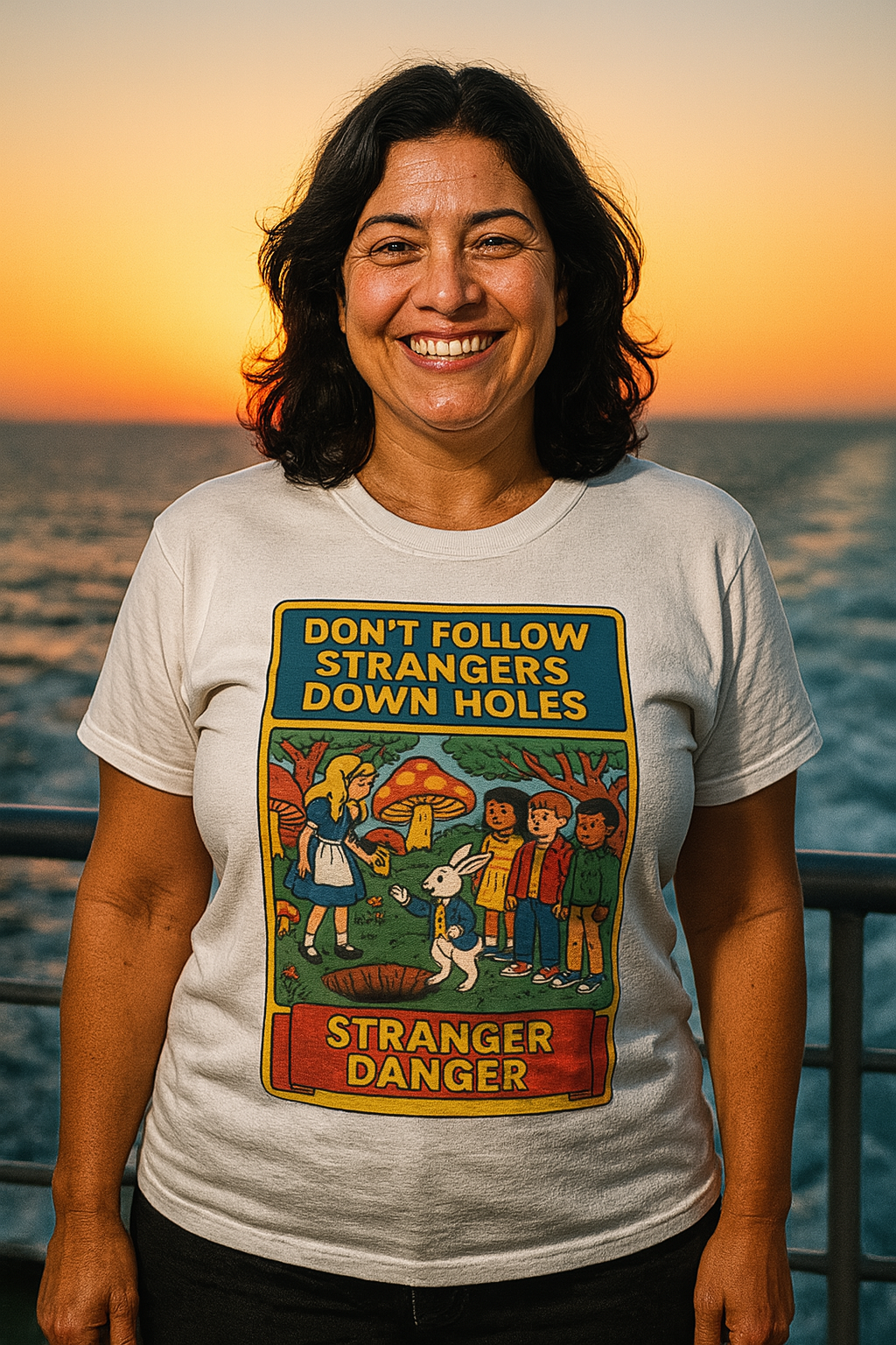 Created by two teachers with a passion for art and imagination, this shirt celebrates whimsy and safety in a creative way. It is perfect for anyone who enjoys unique fashion and memorable designs. With every wear, share your love for Alice and a gentle reminder for adventure with caution.