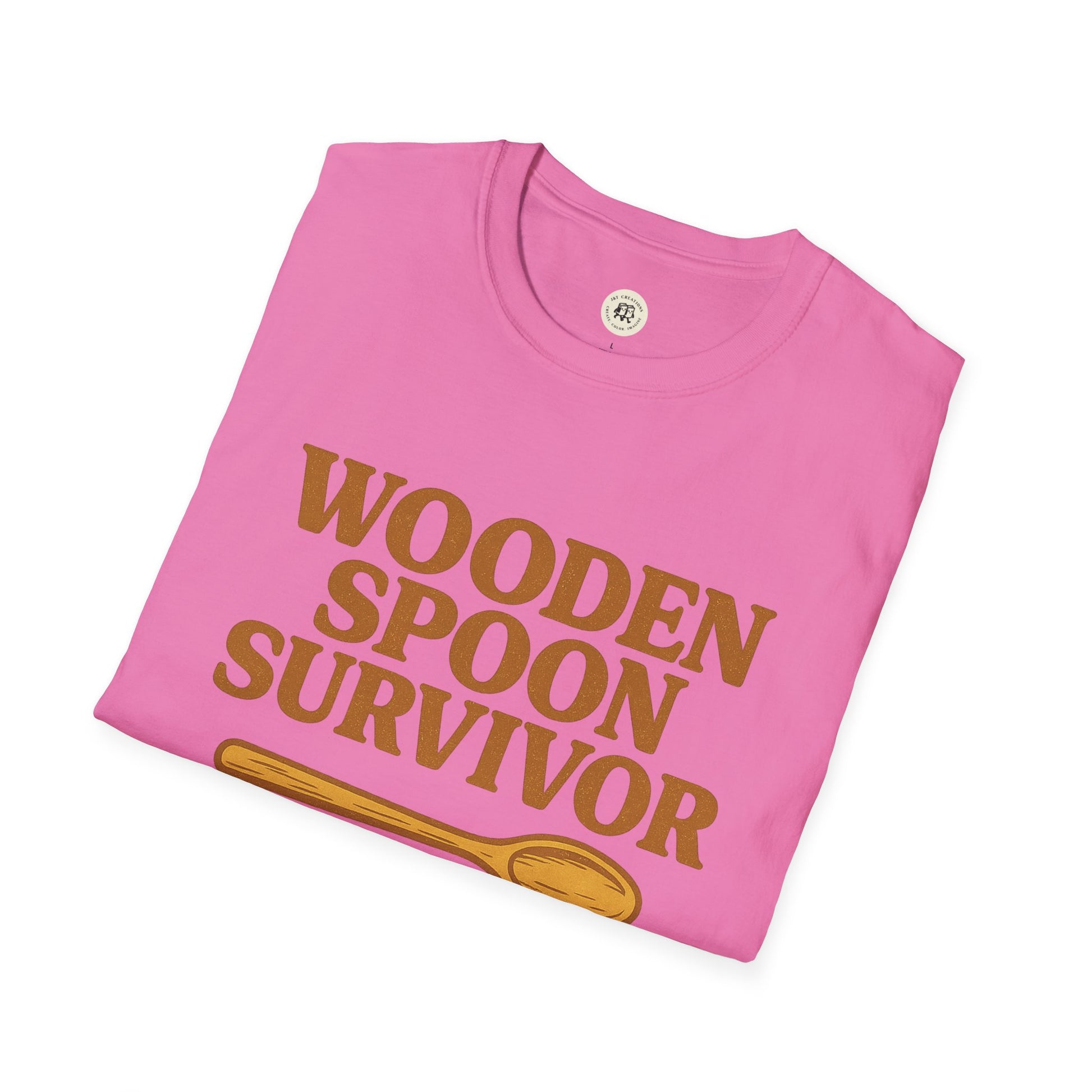 The wooden spoon survivor t-shirt is a must-have for anyone who loves cooking and a good laugh. The shirt features bold text and a simple wooden spoon image. The design stands out in any kitchen or at any food event.